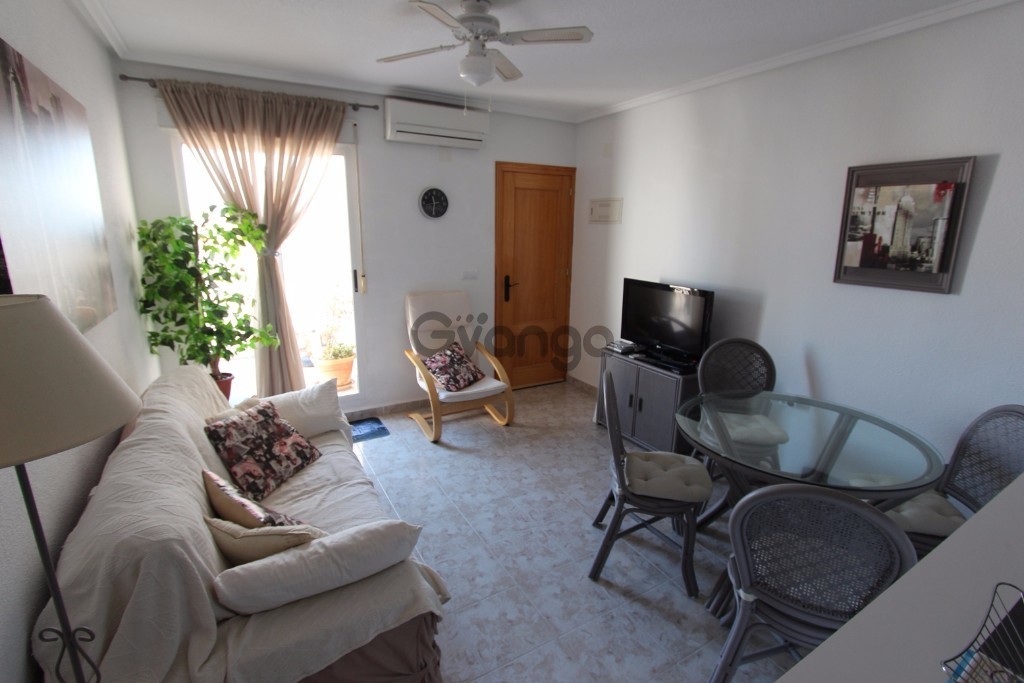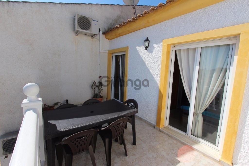 Flawless bungalow with large terrace and communal pool in urbanization El Edén - Los Estaños de Guardamar del Segura.Fantastic bungalow on the top floor in the well reputed urbanization El Edén - Los Estaños of Guardamar del Segura - Costa Blanca Sur. Property in perfect condition with all rooms fully equipped with furniture and whitegoods. It also has air conditioning. The bungalow, ready to move into, has 2 double bedrooms with fitted wardrobes and access to the fabulous terrace of 12 m2 facing south-east from the master one, bathroom, kitchen and living room. In addition, the residential has communal pool and private parking area and is very well connected with amenities and beaches. Communal Pool