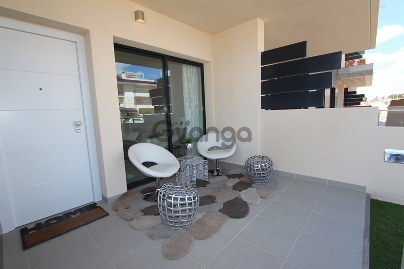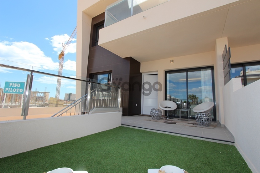 Ground floor bungalow located 300 meters from the beach of Torre de la Horadada , south of Orihuela Costa in Costa Blanca South . The house consists of two bedrooms, two bathrooms, kitchen with living room, and large garden. Residential with swimming pool and gardens. Available also 3 bedrooms. Close to all services. Communal Pool