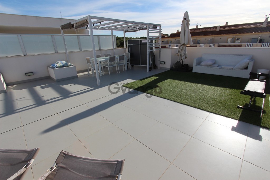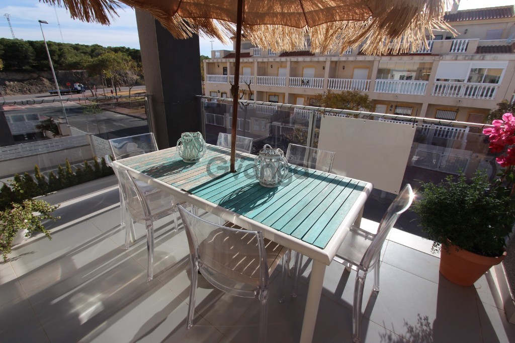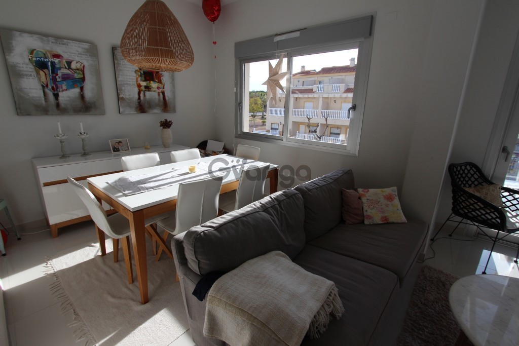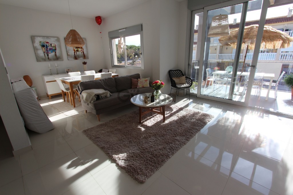 High bungalow like new in the area of El Edén (Guardamar del Segura).The bungalow has two bedrooms and two bathrooms. Open kitchen, a magnificent living room and terrace.The house has underfloor heating in the bathroom, air conditioning, hot-cold, ducts and is fully furnished.It has a private solarium, barbecue area, community pool and garage on the surface. Communal Pool