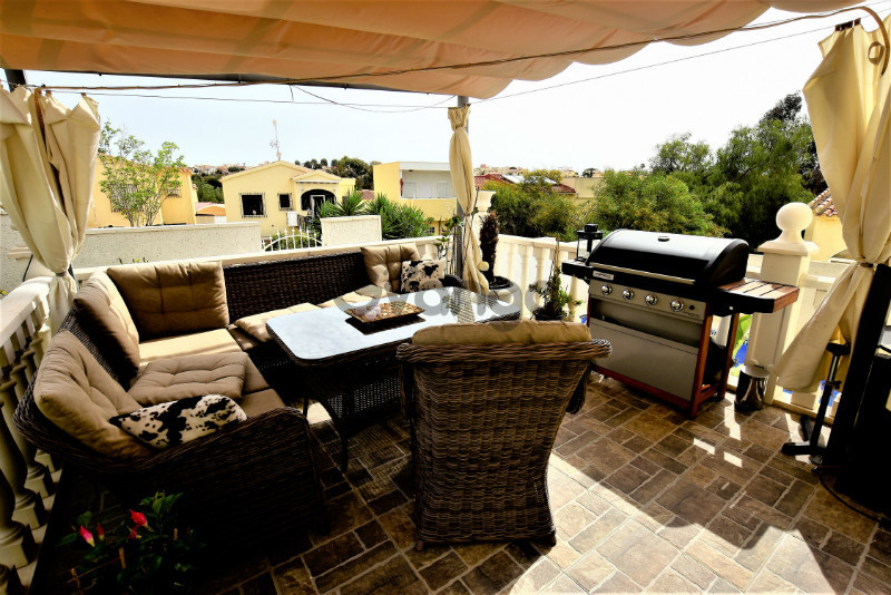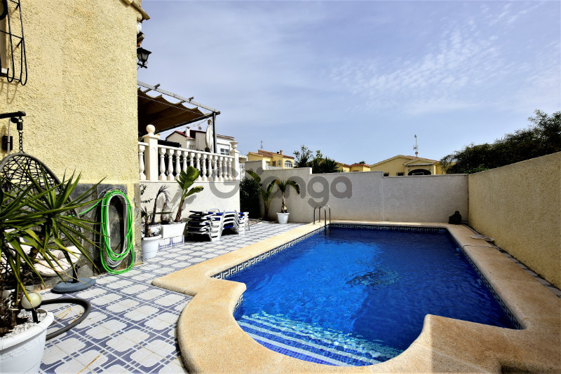 This well maintained south-east facing detached villa is built on a corner plot and positioned in a quiet area of La Marina which needs no work to be done except to move in! The villa hosts 2 double bedrooms with fitted wardrobes, separate kitchen, a lovely modern bathroom with underfloor heating and a utility room. Property comes unfurnished with air conditioning, double glazing and security grills. The outside area offers a large private landscaped garden with lovely shrubs and graveled pathways, private terrace, swimming pool, off street parking with gated entrance. Close to all amenities and worthwhile viewing.