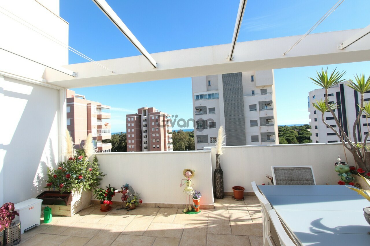 Fantastic penthouse with sea views. The house has two large bedrooms and a third room converted into a spacious office, a fully equipped independent kitchen, two full bathrooms and a large living room with a terrace overlooking the sea. It is adapted for wheelchairs with wide doors throughout the house. It is located in an urbanization with a swimming pool, large gardens, paddle tennis courts, tennis courts and a children's playground. This complex is located two minutes from the main bars and restaurants in the area and about 2 km from the beaches of Guardamar.