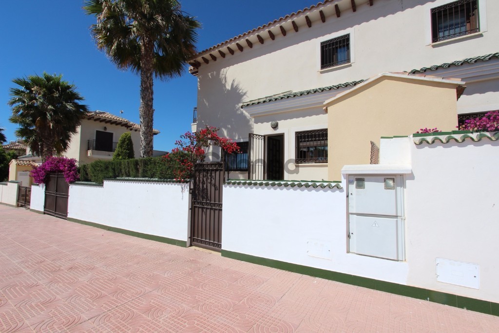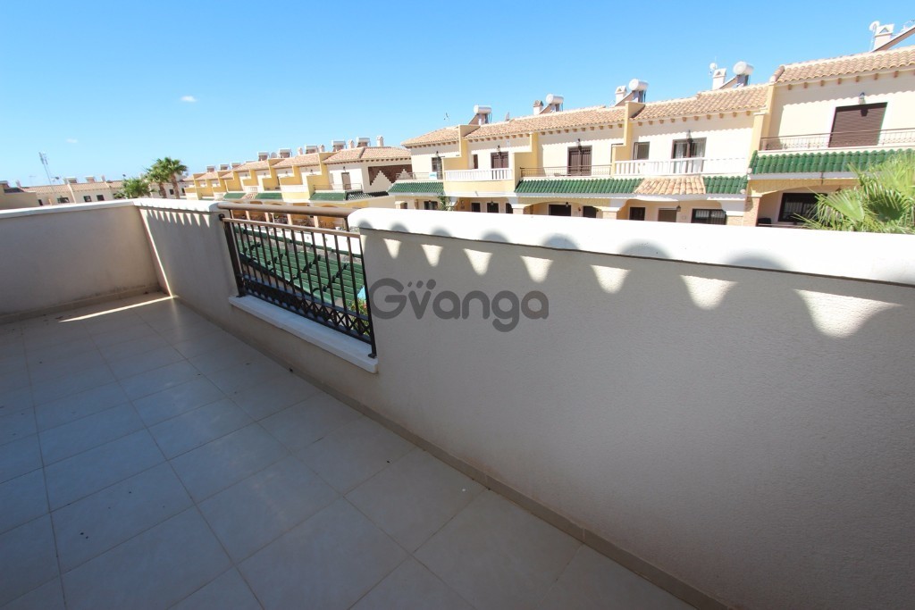 Great 3 bedroom townhouse with private solarium and large gardened plot in Ciudad Quesada - Costa Blanca South. Big house of 140 m2 with 3 bedrooms with fitting wardrobes, 3 bathrooms, kitchen, utility room, patio, large living room and storage room. Equipped with white goods, air conditioning ducts, heating and satellite dish. It has private solarium and terrace. Terrazzo floors and solid wood doors. Outside it has a large garden of 180 m2, parking, barbecue area and communal swimming pool. Location close to the main services and shops in the area, close to the golf course La Marquesa and just minutes from the beaches of Guardamar del Segura. Communal Pool