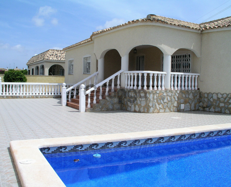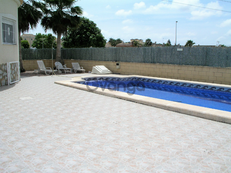 Presenting a well maintained, light and spacious home which needs to be viewed to be appreciated! This detached villa is located in La Marina urbanisation. It comprises of 3 double bedrooms with fitted wardrobes, separate kitchen, lounge/dining area and 2 bathrooms. The villa comes furnished and hosts air conditioning, a cozy fireplace and double glazing. The outside space offers a private tiled garden, lovely terrace, off street parking with a very large under-garage, gated entry and generous sized 9 x 4 pool and storage room. Nearest beaches are 10 minutes drive away and villa is near to all amenities on the community.