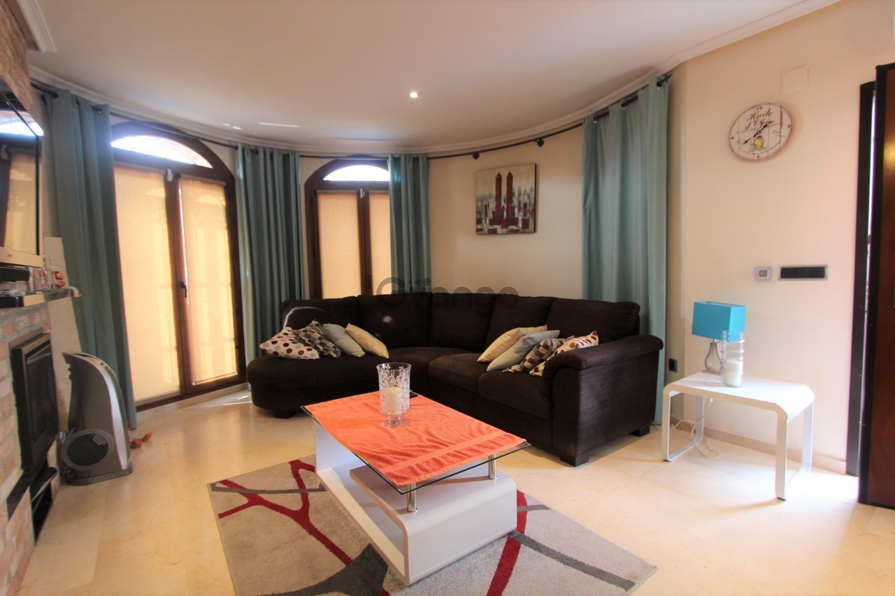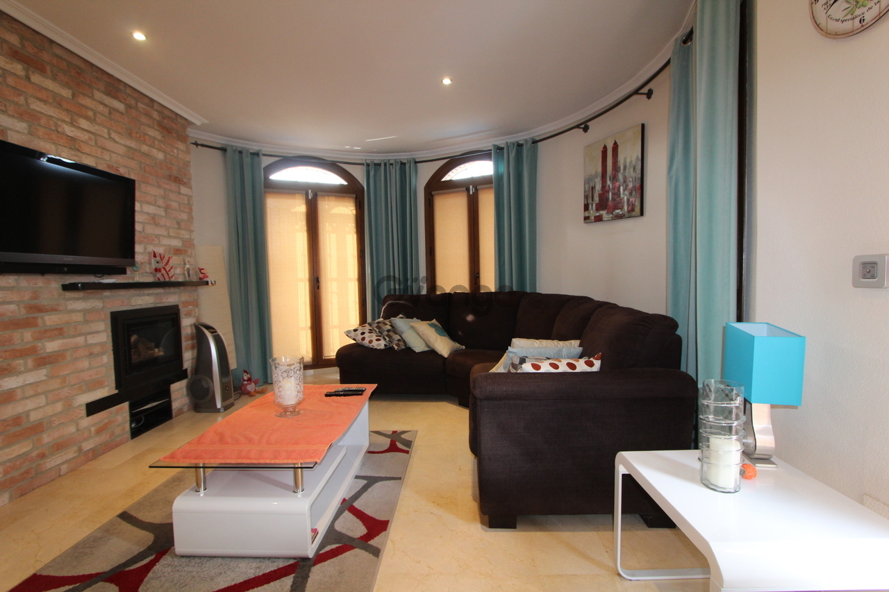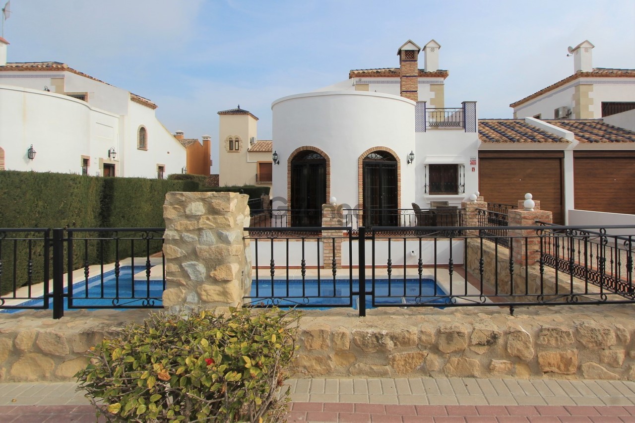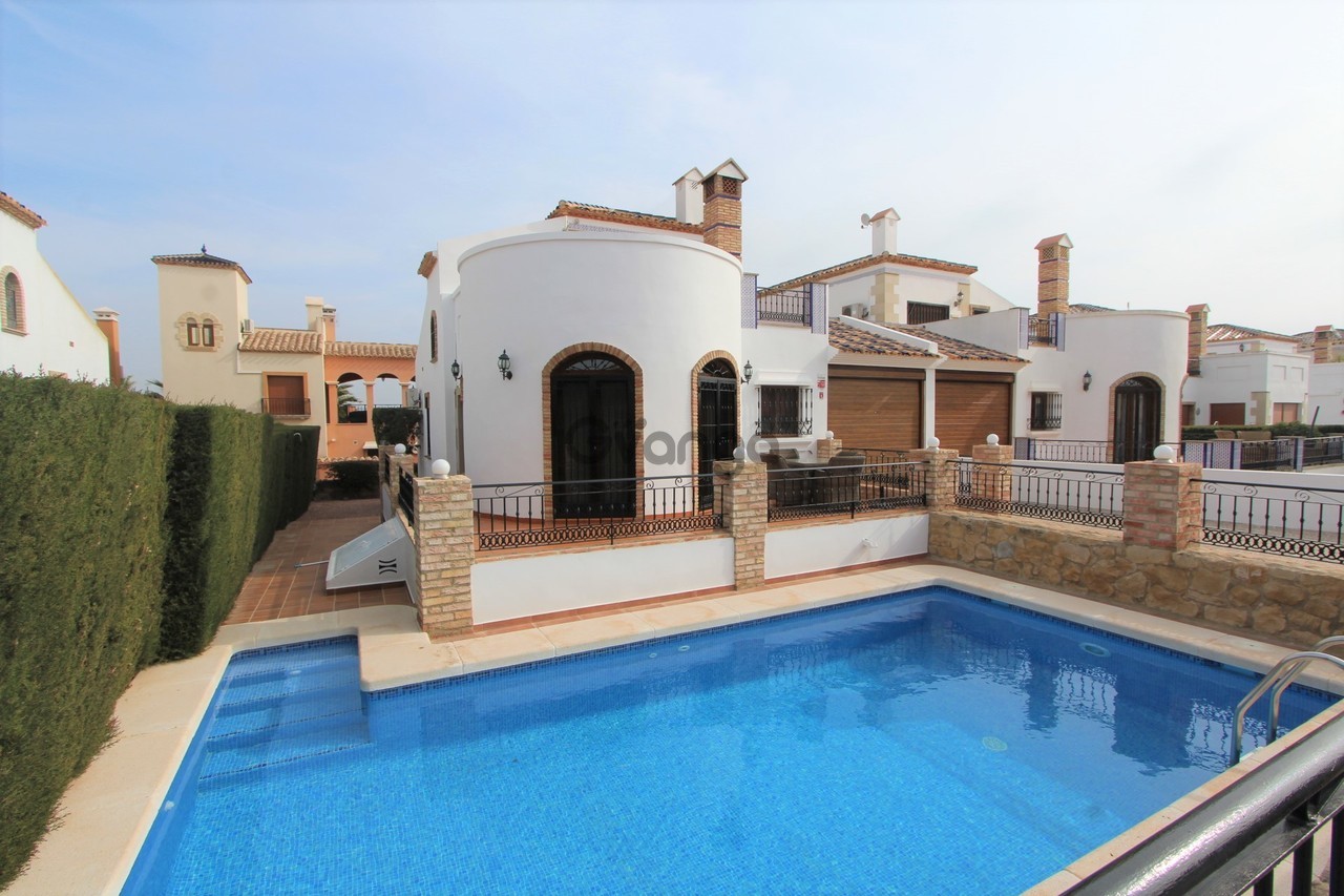 Beautiful Style Villa, which is located on the well-known La Finca Golf Resort, Algorfa. As you enter the ground floor of the property, you walk into the lounge/dining area which is good space, at the far end of this area is a curved semi-circular wall with patio doors that take you out on the terrace. Moving back inside there is a modern kitchen which is fully fitted with all the appliances you would expect including its own drinks cooler and has stunning granite work tops, moving out of the kitchen and to your right a storage room followed by two large double bedrooms with fitted wardrobes as well as a good size family bathroom. There are stairs that take you up to the first floor where you have the master bedroom which has a changing area, fitted wardrobes and its own en-suite shower room, there are sliding doors that take you from the master bedroom out onto a lovely solarium, which is private and offers some lovely views of the mountains in the distance, this is an ideal position to just sit down in the evening and watch the sun set with a drink. Moving outside of the property and to the back, this part of the garden has been laid to gravel and has some trees, shrubs and plants to add some colour, moving to the front of the property you have a lovely patio area which is ideal to sit out in the morning and have breakfast, the patio area overlooks your own private swimming pool and to your left you have a private drive that is sufficient for two cars plus you have a garage with an remote door. What more could you ask for, well this amazing property has the following additional features: Ceiling fans in all the bedrooms, air-conditioning and central heating in all rooms, a log burner in the lounge, security grills, shutters and mosquito nets on all windows, fully alarmed and is being sold fully furnished. This amazing property is close to all the local amenities, such as restaurants, shops and bars and only a short 15-minute drive to the lovely beaches of Moncayor or Guardamar. This property is ready to move into and make it your new home from home and is available for 249,950 euros.