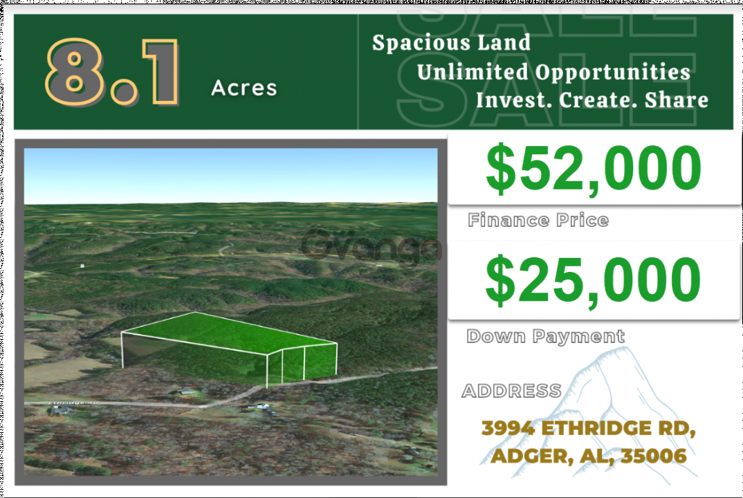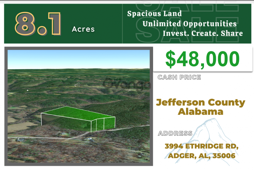 8. 1 Beautiful Wooded Acres Unrestricted-Outdoor Enthusiast, Hunters, Preppers, Campers and Nature Lovers take a Look Mobile Homes Allowed -Financing Also AvailableOPTIONS ARE ENDLESS Build your dream cabin or simply put your Mobile Home right here on this gorgeous 8. 1-acre property in Jefferson County, Alabama. This lot is nestled in a prime location in Ethridge Rd in Adger, just 14. 6 miles southeast of Bankhead Lake. It is just 34 minutes drive to Bessemer and 43-minute drive to downtown Birmingham. HUNTERS AND NATURE LOVERS, Enjoy nature here among the white-tailed deer, wild turkey, bobwhite quail, feral hogs, waterfowl, rabbits, squirrel, mourning doves, and many other species that live in Alabama. OUTDOOR ENTHUSIASTS RV, ATV, CAMPERS,Bring it on Bring your toys and enjoy. This area has it all. PREPPERS this is a great property for you. The area does not have long, cold winters, and Alabama is also fortunate to have the year-round growing season, so farmers and hobby gardeners can have a grow your own approach to supplementing food supplies. Calltext. No Obligation, Just Answers. There are lots of attractions that await you here. If you love nature, you can live right among all the natural beauty Alabama is so famous for. You can also drive up to Oak Mountain State Park, just an hour drive east. Or you can have ALL the Entertainment and Dining and Shopping opportunities you could want in Birmingham. Visit the Barber Vintage Motorsports Museum, explore the Birmingham Museum of Art, and take a self-guided tour of the Birmingham Civil Rights Institute. Best things to do in Birmingham with kids include the McWane Science Center, Vulcan Park and Museum, Sloss Furnaces, the Alabama Sports Hall of Fame and the Birmingham Zoo.