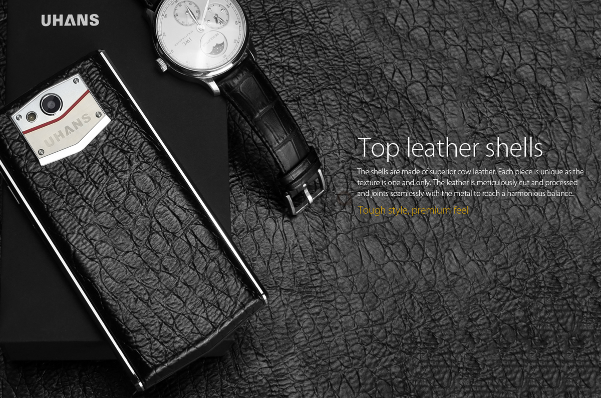 Combining form and function the UHANS U100 Smartphone will appeal the design conscious Smartphone users who are looking for something more than a plastic rectangular phone. It looks like a luxury brand Vertu phone but its affordable price makes it available to all. The cowhide leather rear is a beautiful touch and is sure to get people's attention while the brushed metal sides and angular front make it stand out as an up market phone of action.
