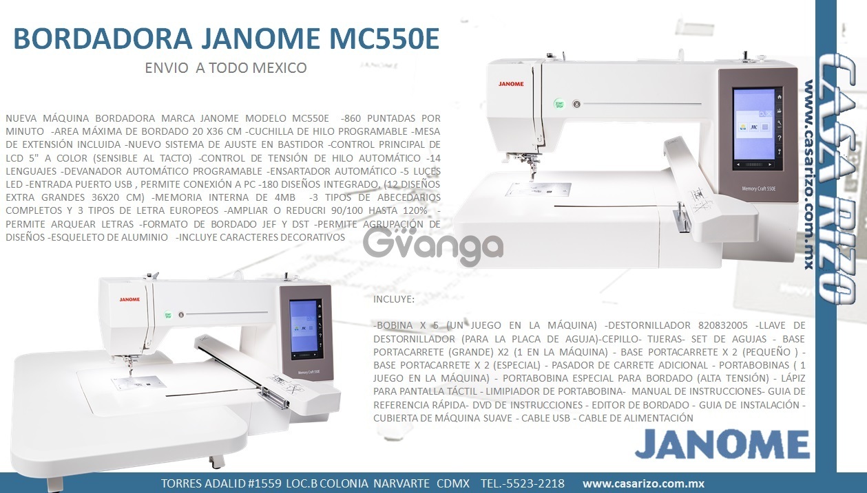 Nueva máquina bordadora marca janome modelo mc550e -860 puntadas por minuto -area máxima de bordado 20 x36 cm -cuchilla de hilo programable -mesa de extensión incluida -nuevo sistema de ajuste en bastidor -control principal de lcd 5" a color (sensible al tacto) -control de tensión de hilo automático -14 lenguajes -devanador automático programable -ensartador automático -5 luces led -entrada puerto usb, permite conexión a pc -180 diseños integrado, (12 diseños extra grandes 36x20 cm) -memoria interna de 4mb -3 tipos de abecedarios completos y 3 tipos de letra europeos -ampliar o reducir 90/100 hasta 120% -permite arquear letras -formato de bordado jef y dst -permite agrupación de diseños -esqueleto de aluminio -incluye caracteres decorativos