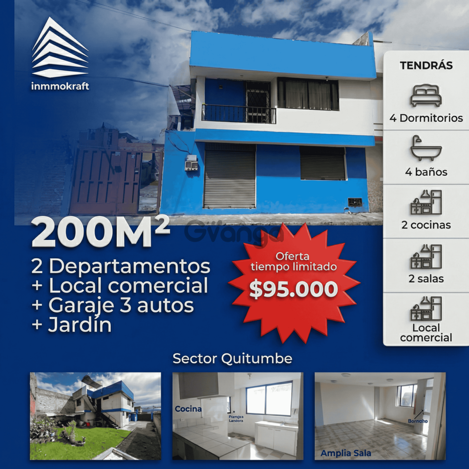 Distribución: 4 habitaciones | 4 baños | 2 salas | 2 cocinas.