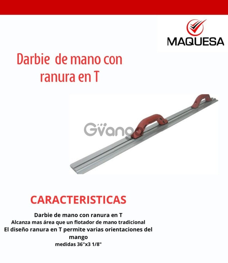 Llana de mano tipo DARBY 36 pulg. con ranura en T MARSHALLTOWN. Calidad USA. Una herramienta muy util y practica. Medidas, largo 36 pulgada, ancho 3 1/8 pulgadas. Alcanza más area que una llana flotadora de mano tradicional. El diseño de ranura en "T" permite varias orientaciones de los mangos. Adquiere gran calidad a su inversión. US$ 74.25 iva incluido.