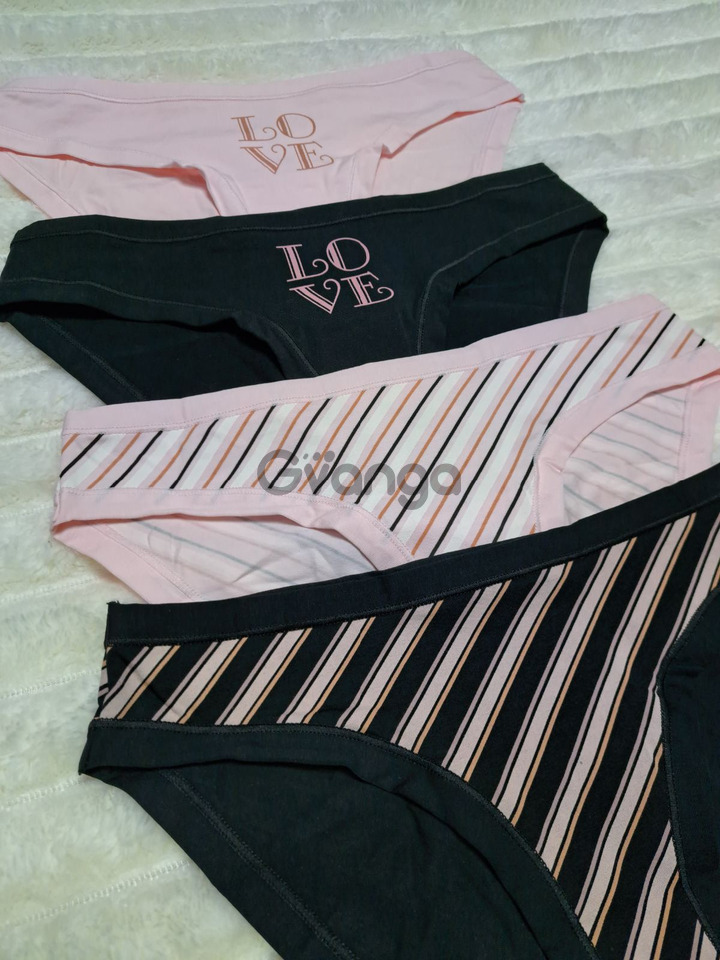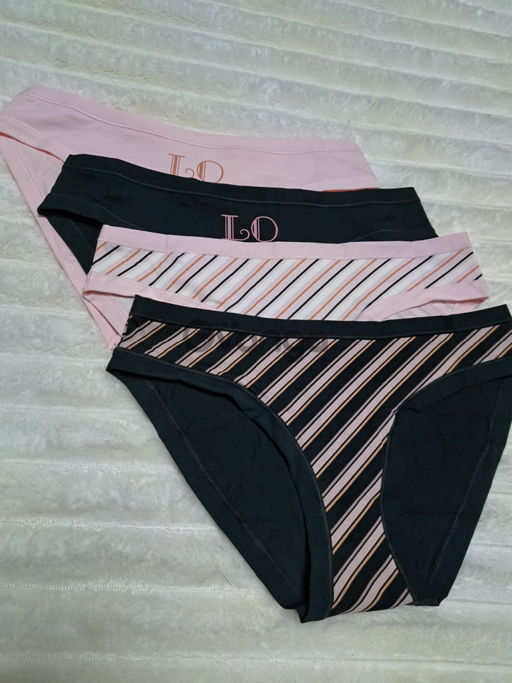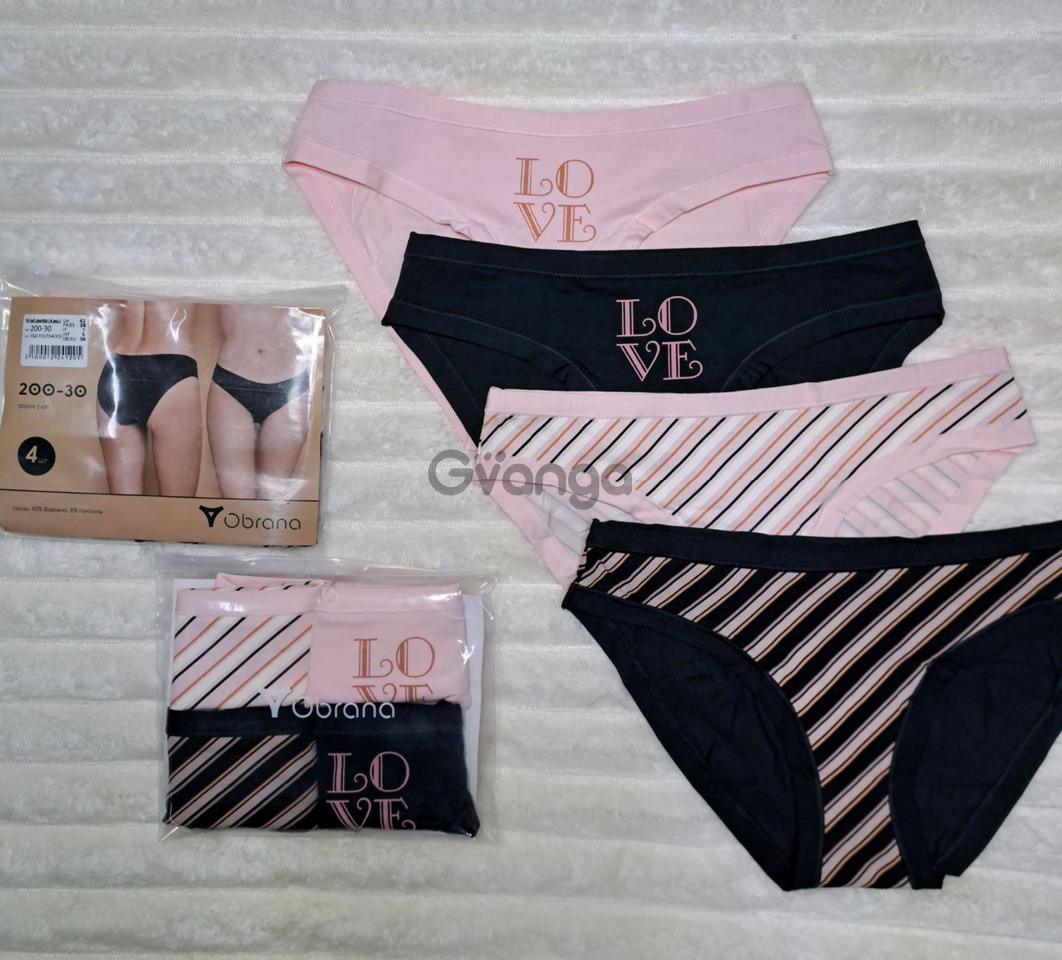 Вам представлена новая модель трусиков-слип декорированные принтом в полоску и однотонные с надписью "Love" в наборе. Женское бельё в упаковке из 4 шт. в ассорти цветов.