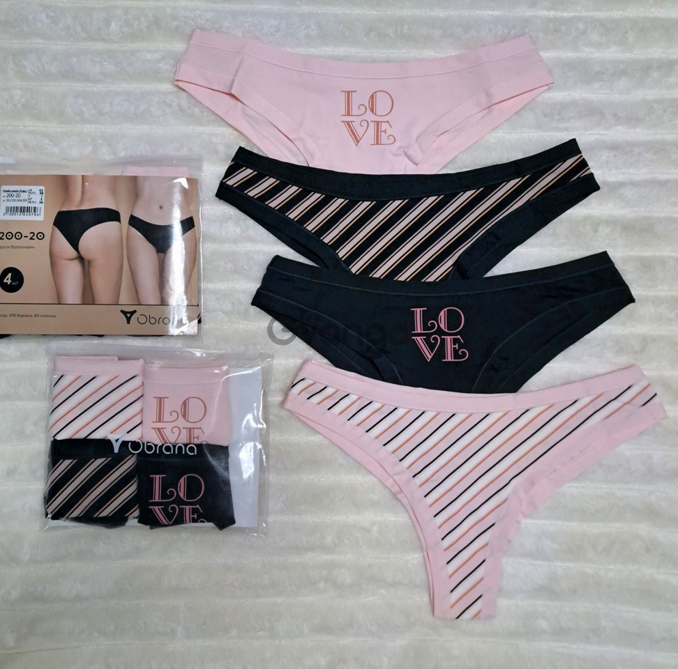 Хлопковые женские трусики-бразилианы (в наборе 4 штуки в упаковке) в палитре цветов (чёрный, розовый), декорированы принтом-надписью LOVE и в цветную полоску.