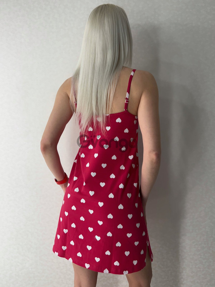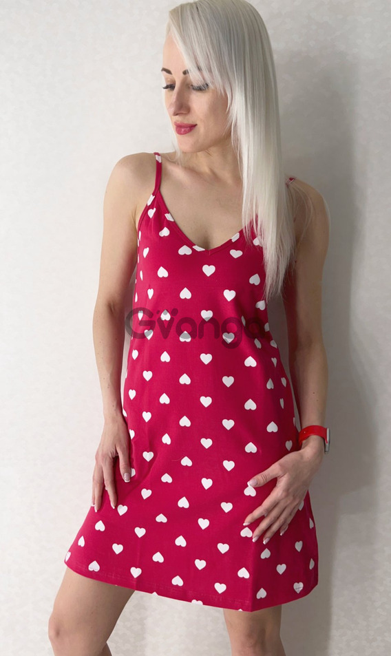 Ночнушка изготовлена с хлопка красного цвета с добавлением эластана. Имеет полуприталенный силуэт, на тонкой бретели, длиной выше колен, с V-образным вырезом.