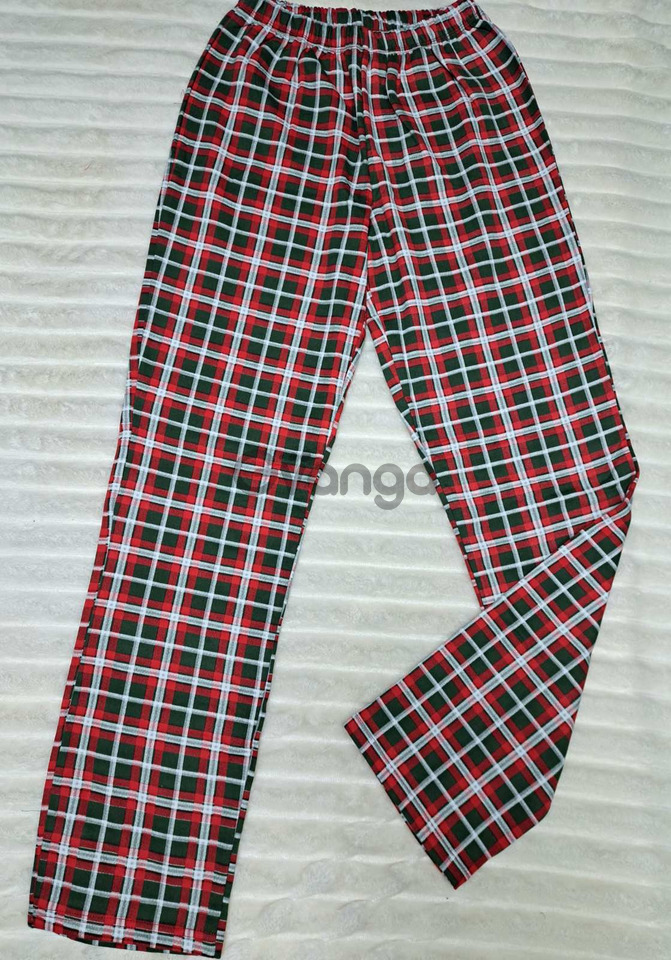 Брюки прямого кроя выполнены в классическую клетку в красно-зелёной гамме, благодаря чему гармонично дополняют верх.