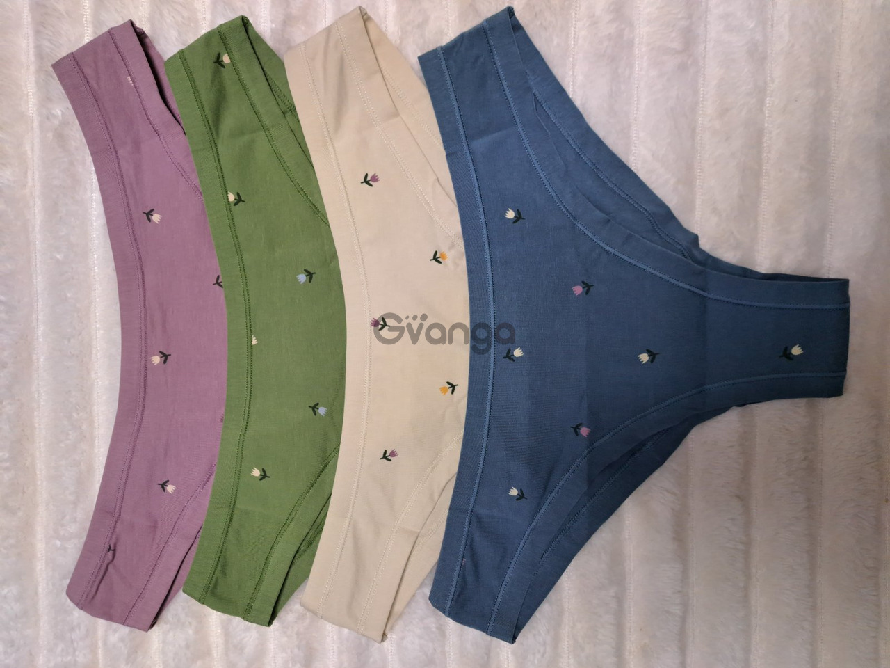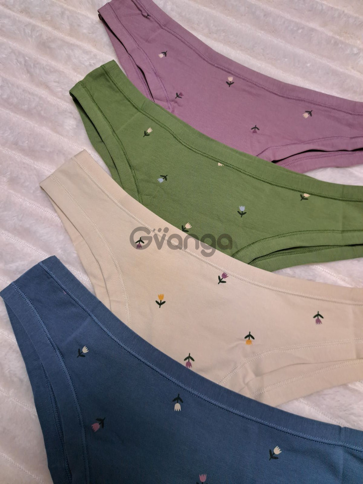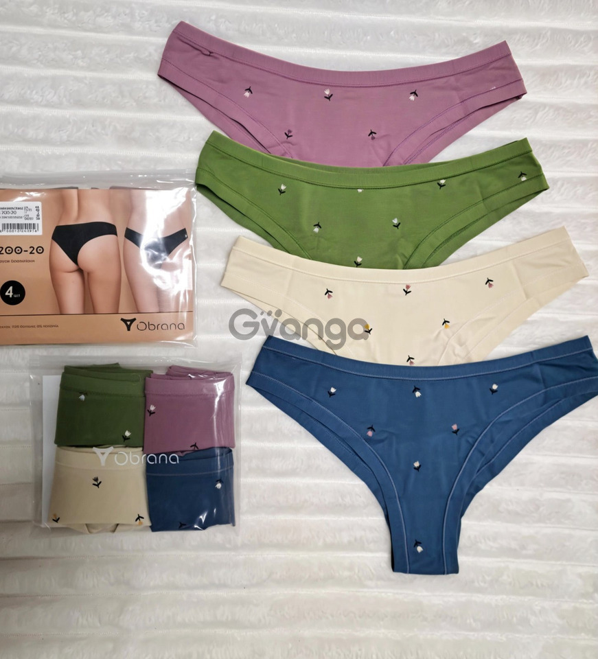 Набор женских трусов - 4 шт. в упаковке в разных цветах (синий, натуральный, зелёный, сереневый), украшен цветочным принтом.