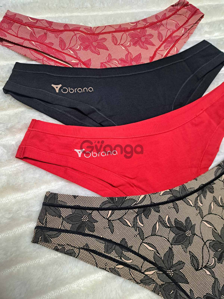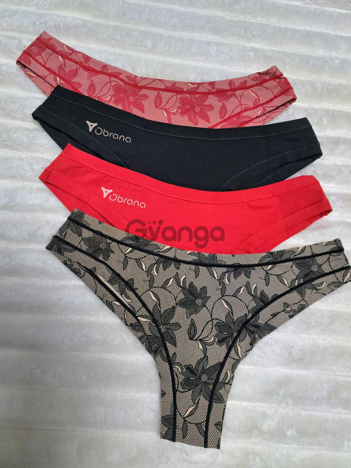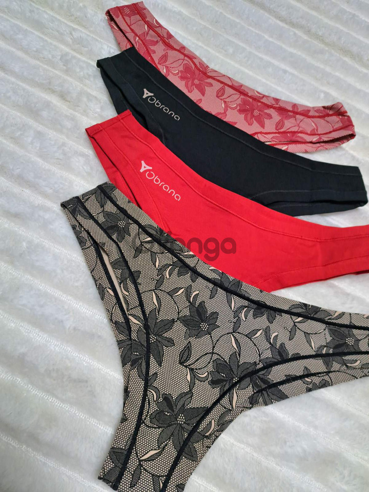 Комплект состоит из 4 разноцветных трусиков, двое однотонных (чёрный, красный) и двое бежевых декорированых цветочным принтом.