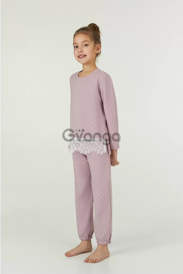 Піжама рожевого кольору з принтом "горошок". Джемпер прикрашений привабливий білим мереживом, з боків є розрізи.