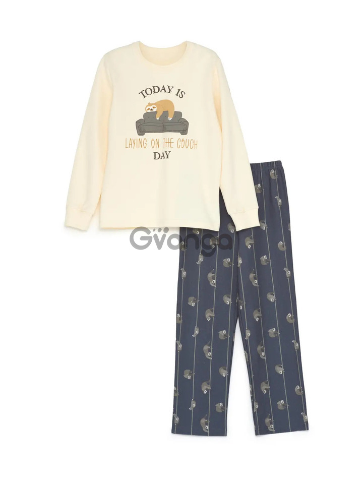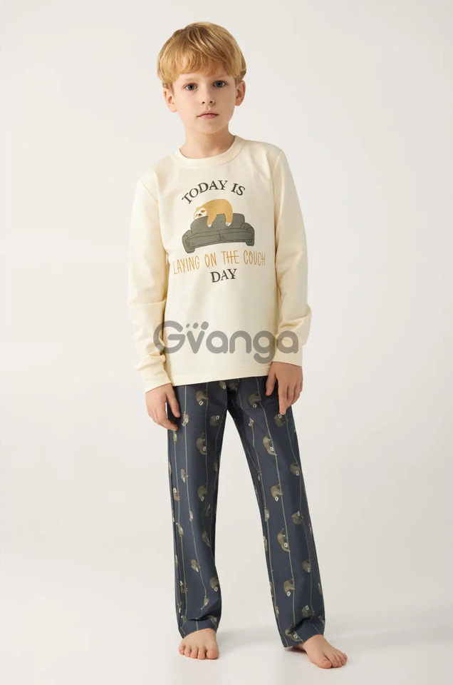Модель комплекту піжами для хлопчиків складається із джемпера та штанів. Має напівприталеного крою, вироблений з бавовняного полотна (двунитки).
