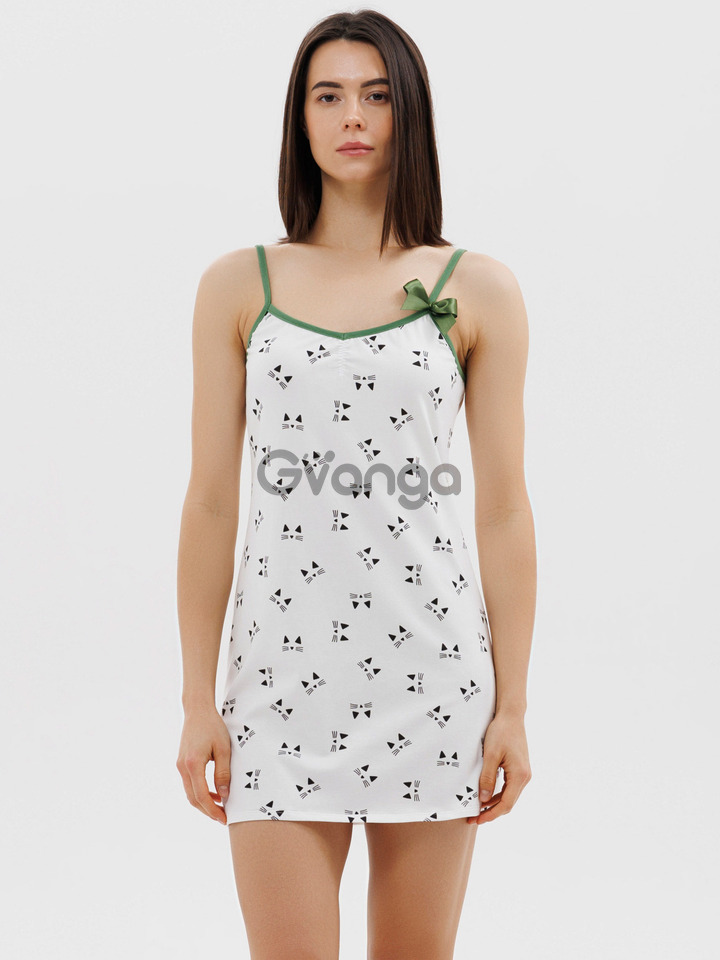 Модель сорочки виконана на тонких бретелях зеленого кольору, декорована принтом котики, середньої довжини, має напівприлягаючий силует.