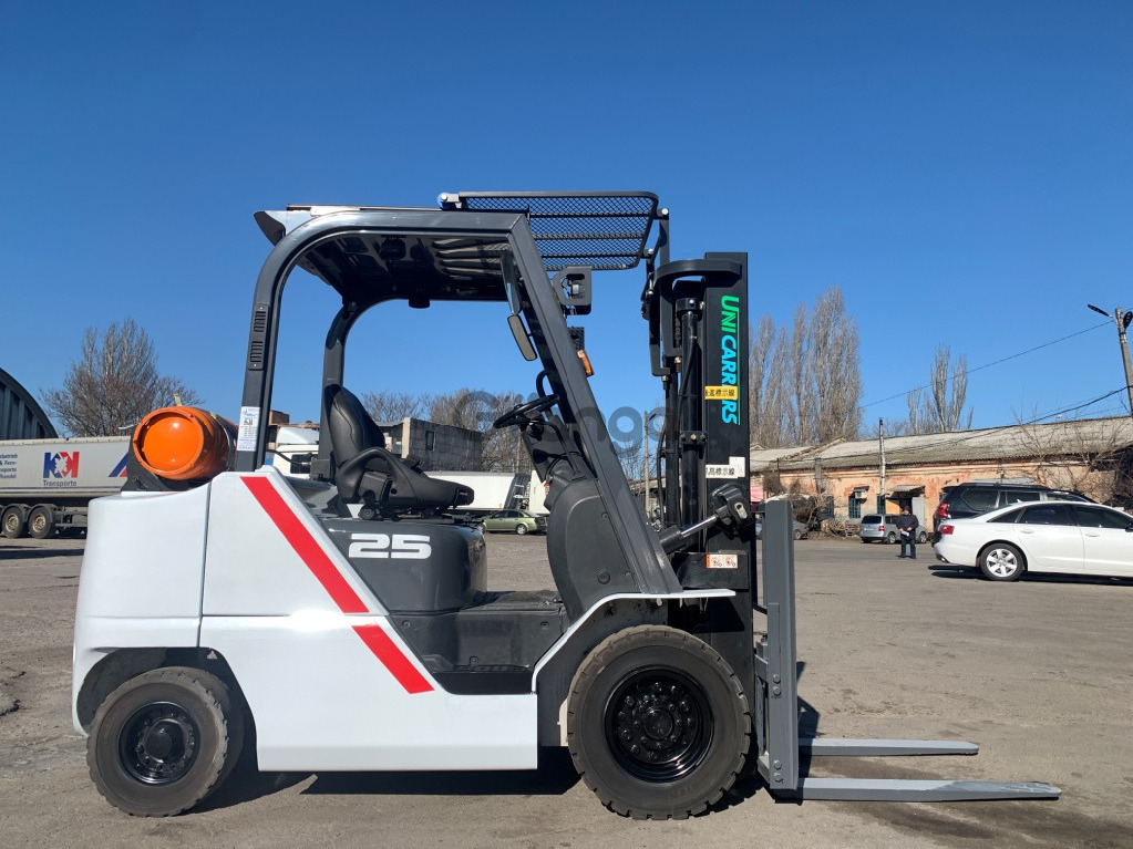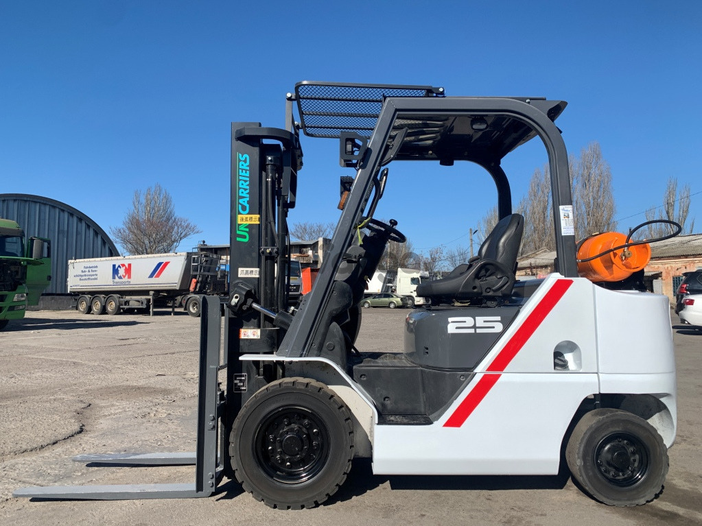 Модель: FHGE25T5. Номiнальна вантажопідйомність 2.5 тонни. Максимальна висота підйому вантажу 3 метри. Щогла двохсекційна (duplex) яка не втрачає вантажопідйомності при висоті підйому. Двигун газ-бензиновий, з заводським газовим обладнанням, завдяки чому автонавантажувач у теплу пору року можє запускатись вiдразу на газу, без прогріву системи на бензині. 2018 рiк (напрацювання 3697 мотогодин). Меню перекладено англійською мовою для зручності. Коробка перемикання передач надiйна i найпоширенiша на данний час - гiдромеханiка (автоматична із гідротрансформатором). Обладнаний найсучаснішим двигуном, економічним інжекторним Nissan GK25. 4-циліндровий, робочим об'ємом 2.5 літра і потужністю 54 к. с. який славиться своєю надійністю і невибагливістю і без змін встановлюється на автонавантажувачах по сьогоднішній день і головне ремонтопридатний. Колеса 12 діаметра на ведучiй осі, що покращує прохідність автонавантажувача і збільшує його кліренс.