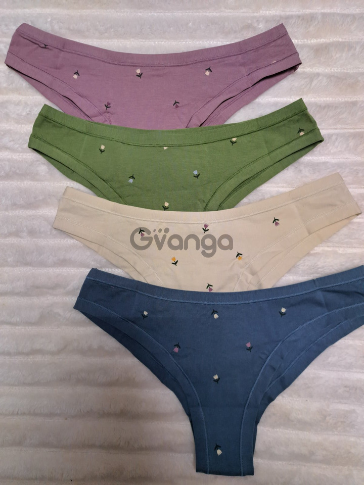 Набір жіночих трусів - 4 шт. в упаковці в різних кольорах (синій, натуральний, зелений, бузковий), прикрашений квітковим принтом.