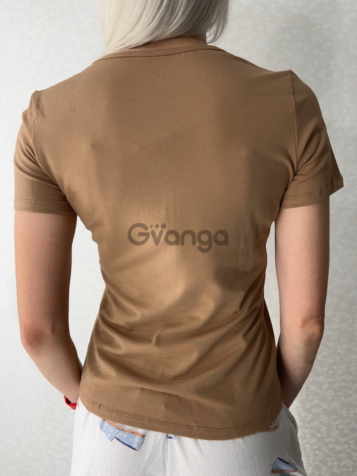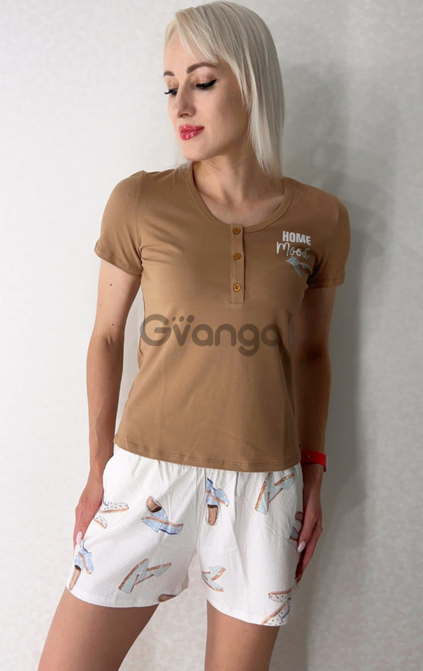Комплект складається із короткої футболки приємного карамельного відтінку і білих шорт з оригінальним принтом.