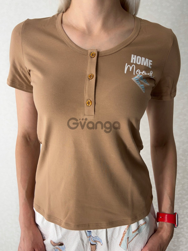 На футболці — акуратна застібка на гудзиках і напис Home Mood, яка підкреслює домашній затишок.