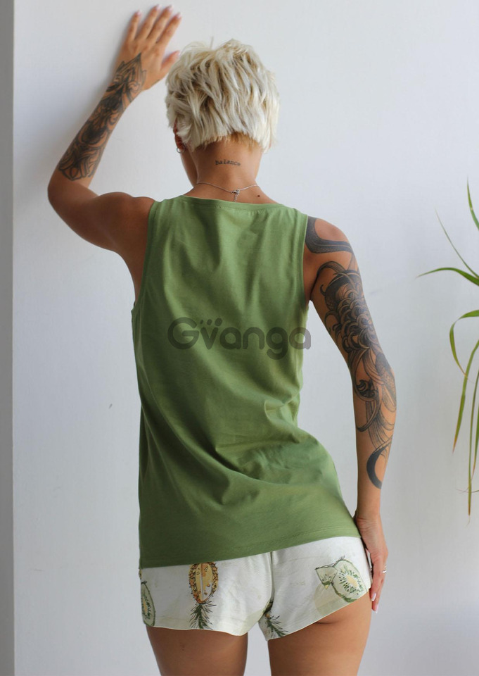 Майка з круглим вирізом для горла, зеленого кольору, на широких бретелях, приталеного крою.