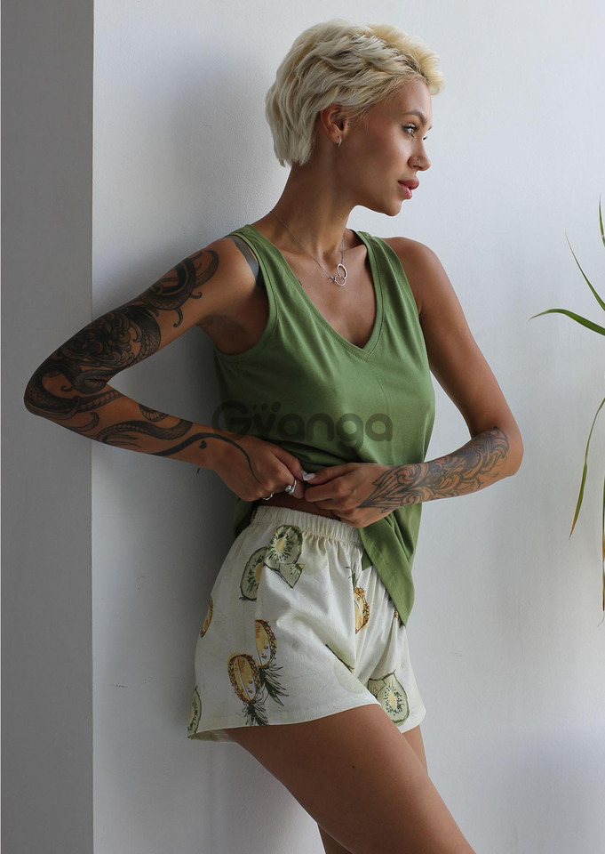 Шорти напівприталеного крою, прикрашені принтом "ківі та ананаси", що надасть піжамі елегантності та індивідуальності.