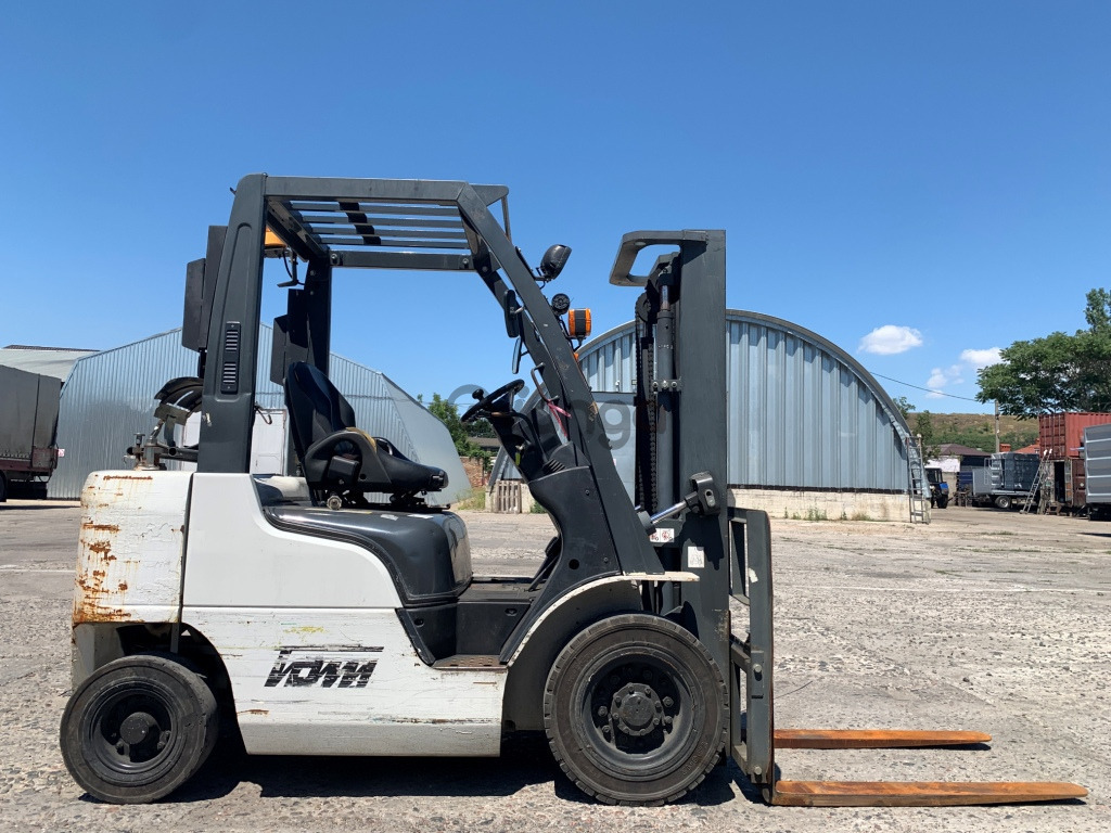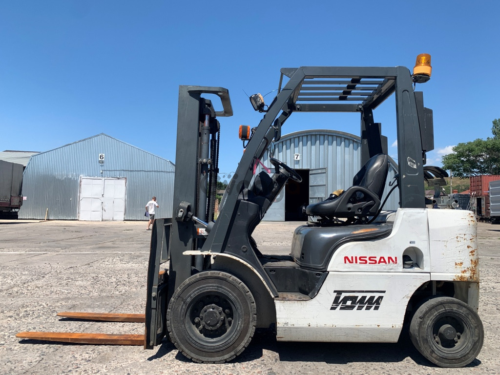 Вилковий автонавантажувач Nissan на 2 тонни з напрацюванням лише 1719 мотогодин. Модель NP1F2A20D. Рік випуску 2012. Номiнальна вантажопідйомність 2 тонни. Максимальна висота підйому вантажу 2.8 метри. Щогла двохсекційна (duplex) яка не втрачає вантажопідйомності при висоті підйому. Двигун газ-бензиновий, з заводським газовим обладнанням, завдяки чому автонавантажувач у теплу пору року можє запускатись вiдразу на газу, без прогріву системи на бензині. Коробка перемикання передач надiйна i найпоширенiша на данний час - гiдромеханiка (автоматична із гідротрансформатором). Обладнаний сучасним економічним інжекторним двигуном Nissan K21. 4-циліндровий, робочим об'ємом 2.1 літра і потужністю 48 к. с. який славиться своєю надійністю і невибагливістю і без особливих змін встановлюється на автонавантажувачах по сьогоднішній день і головне ремонтопридатний. Колеса 12 діаметра на ведучiй осі, що покращує прохідність автонавантажувача і збільшує його кліренс. Управління гідравлікою здійснюється простою і перевіреною часом системою - важелями. Обладнаний спеціальною запатентованою одноважельною системою Nissan яка дозволяє одночасно брати піддон на себе і піднімати його вгору.