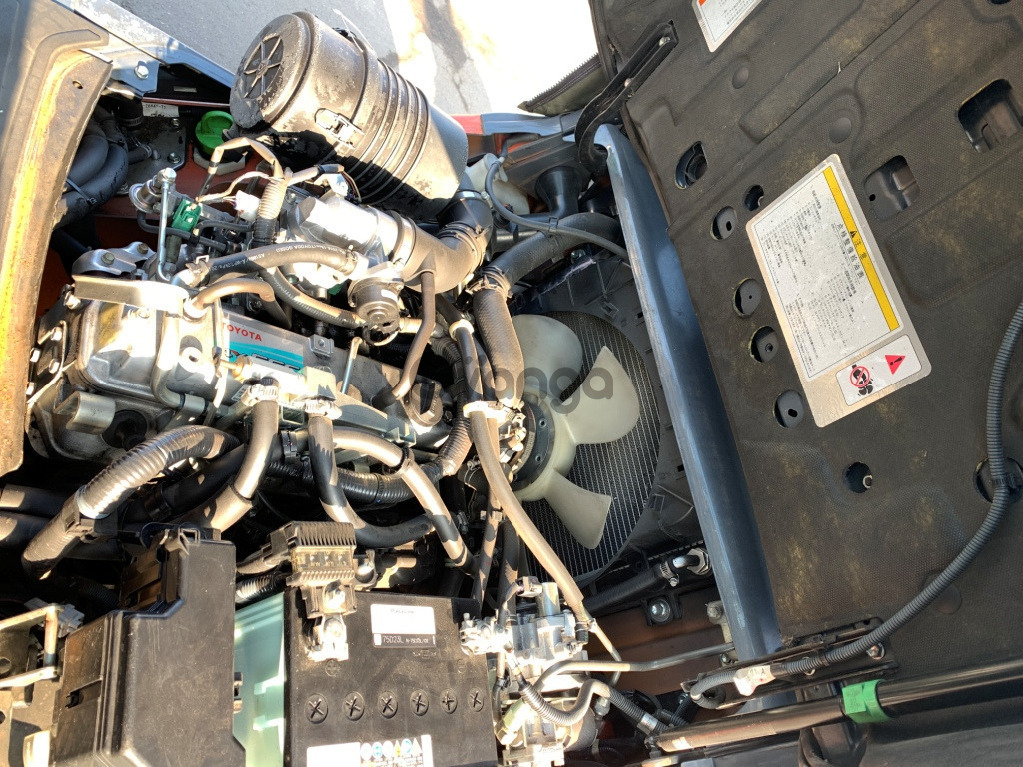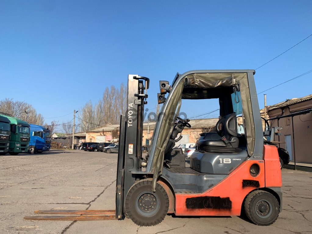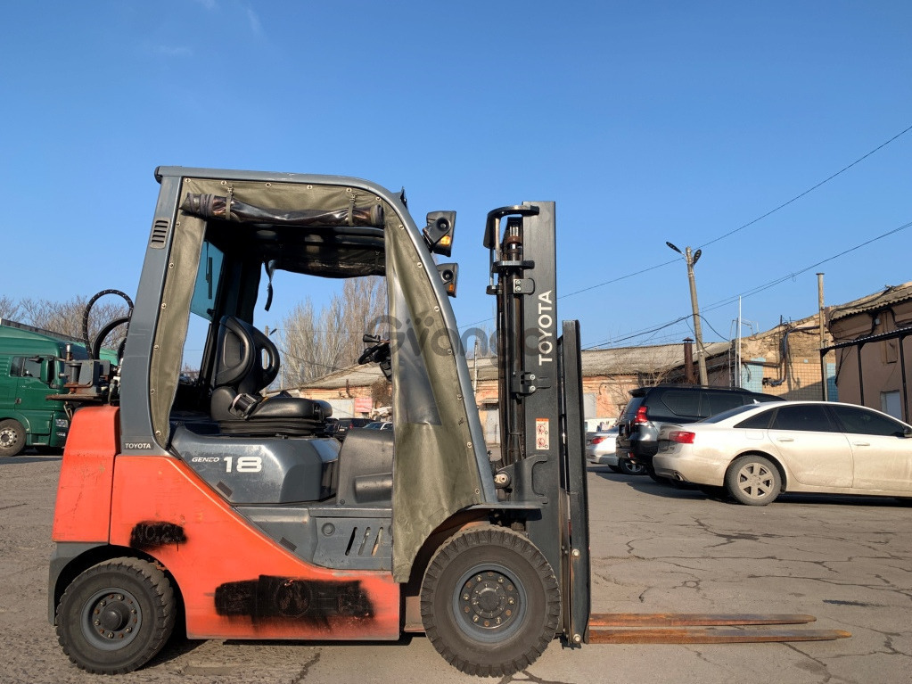 Вилковий автонавантажувач Toyota, з кабiною та пічкою. 2016 року. Модель 02-8FG18. Номiнальна вантажопідйомність 1.8 тонни. Максимальна висота підйому вантажу 3 метри. Щогла двохсекційна (duplex) яка не втрачає вантажопідйомності при висоті підйому. Двигун газ-бензиновий, з заводським газовим обладнанням, завдяки чому автонавантажувач у теплу пору року можє запускатись вiдразу на газу, без прогріву системи на бензині. Коробка перемикання передач надiйна i найпоширенiша на данний час - гiдромеханiка (автоматична із гідротрансформатором). Обладнаний сучасним економічним інжекторним двигуном Toyota 4Y . 4-циліндровий, робочим об'ємом 2.2 літра і потужністю 48 к. с. який славиться своєю надійністю і невибагливістю і без особливих змін встановлюється на автонавантажувачах по сьогоднішній день і головне ремонтопридатний. Управління гідравлікою здійснюється простою і перевіреною часом системою - важелями. Додатково обладнаний кабіною та пічкою для роботи в холодну пору. Колеса 10 діаметра на ведучiй осі, що покращує прохідність автонавантажувача і збільшує його кліренс.
