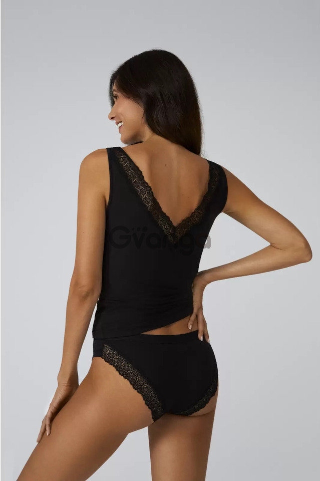 Модель майки на широкій бретелі та привабливим мереживом в зоні декольте.