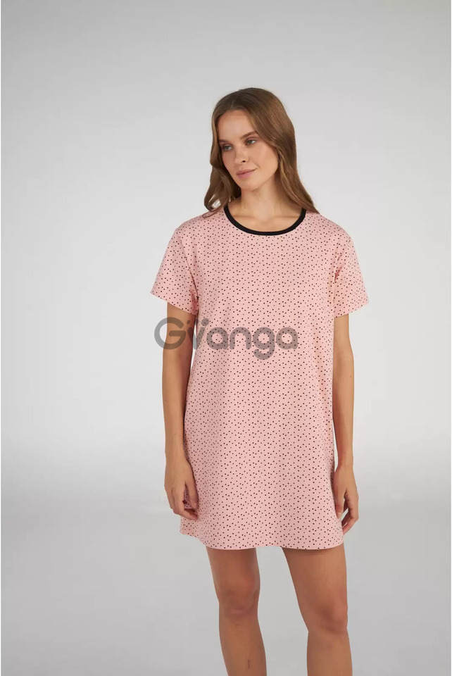 Нічнушка з якісної бавовни персикового кольору. Виріб приталеного силуету, з короткими рукавами, довжина вище колін.