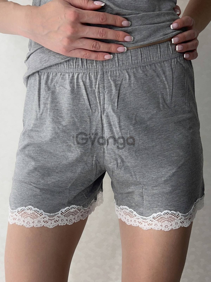 Шорти вільного крою з еластичним поясом доповнені таким самим мереживом по краю штанин.
