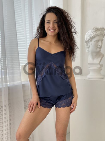 Виріб виготовлено із шовкового полотна синього кольору. Комплект піжами складається із майки приталенного крою, на тонкій бретелі, прикрашена мереживною вставкою у виді "кута".
