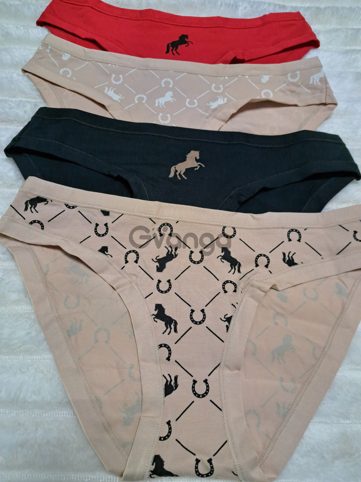 Набір жіночих кольорових трусиків-сліп однотонних і малюнком конячки та підкови. Модель білизни в упаковці із 4 штук різного забарвлення. Бавовна чудово проводить повітря, дуже міцна і довговічна.