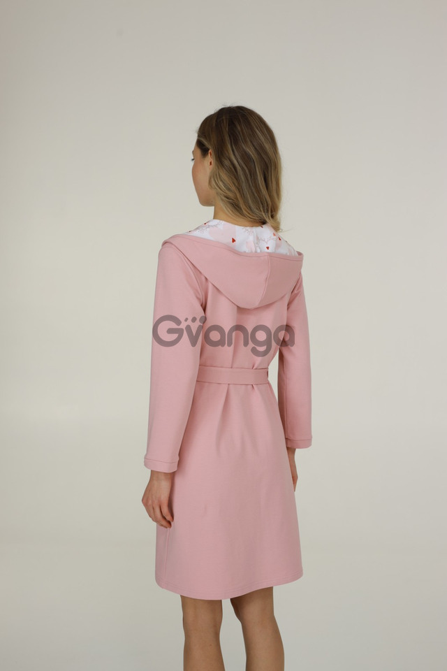 Домашній халат виконаний в рожевому кольорі, вільного силуету, довжиною вище колін, зав'язується на пояс, з довгим рукавом.