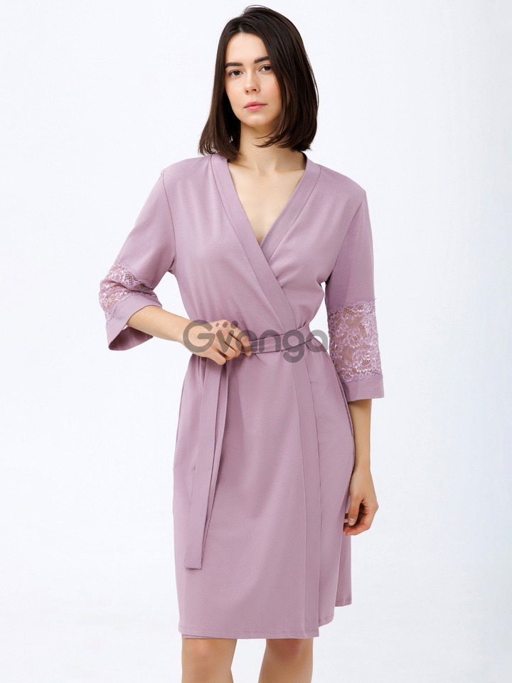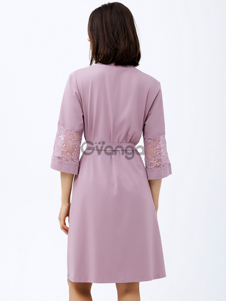 Модель халату зав'язується на пояс, з рукавами довжиною 3/4 прикрашені мереживними вставками.