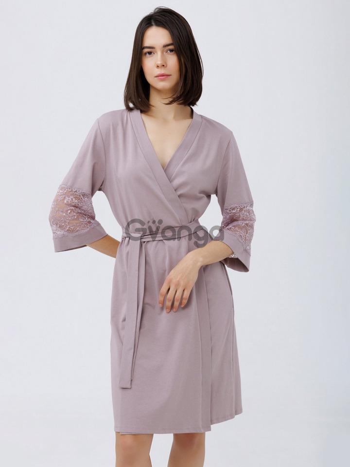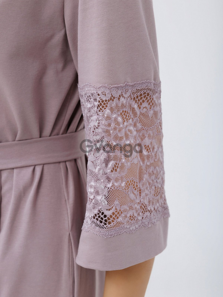 Модель халату зав'язується на пояс, з рукавами довжиною 3/4, прикрашені мереживом.
